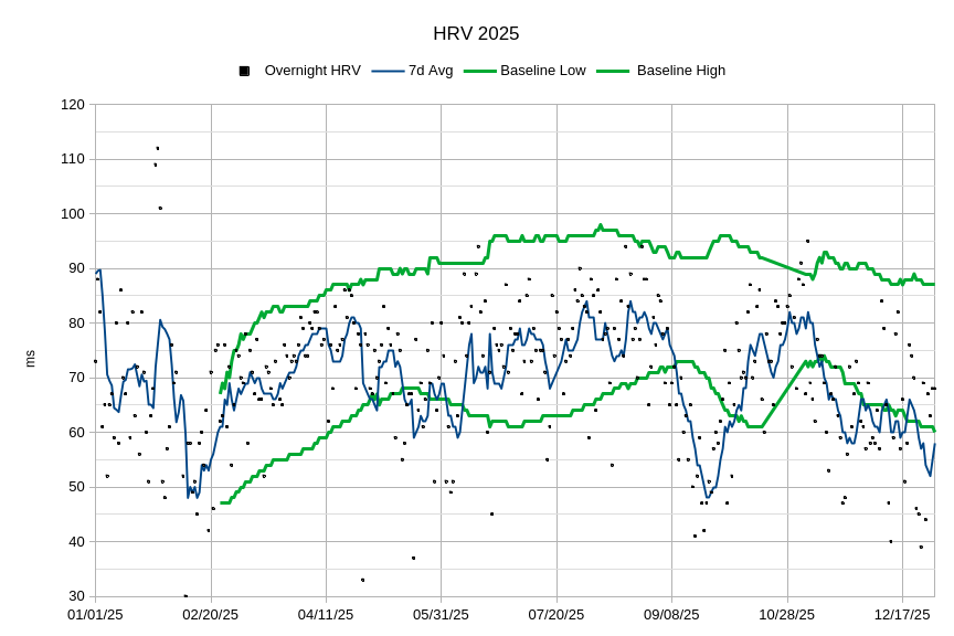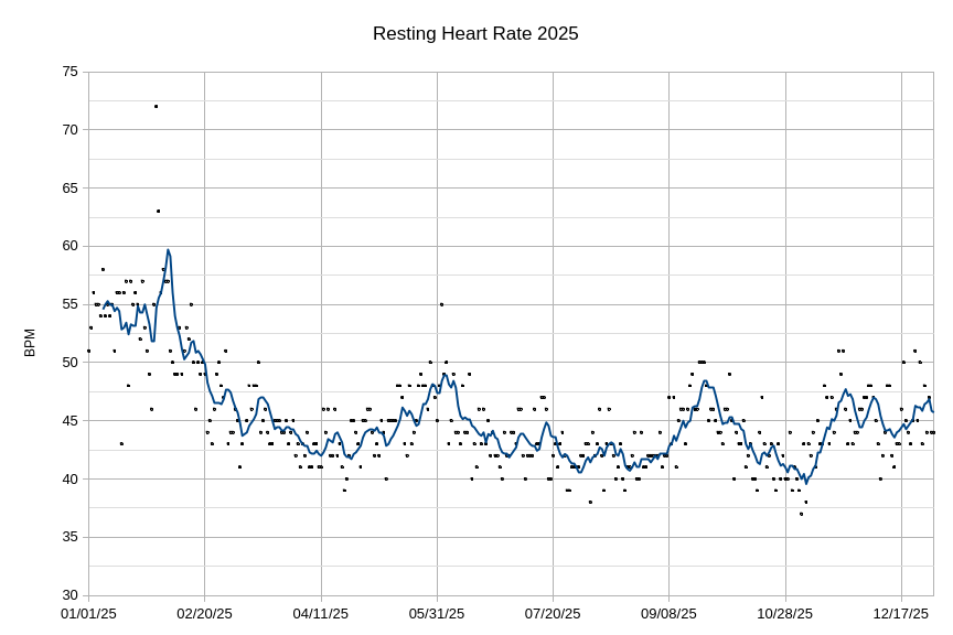This is the first time I’m presenting Heart Rate Variability (HRV) data . It’s sort of a measure of how responsive your heart is to changes in demand from activities. There are typical non-clinically worrying ranges people will have. For an individual that tracks these changes it can be indicative of something like over training, illness, over-stress, not enough sleep, et cetera. when it drops below that person’s standard value range. The chart below is for my values.