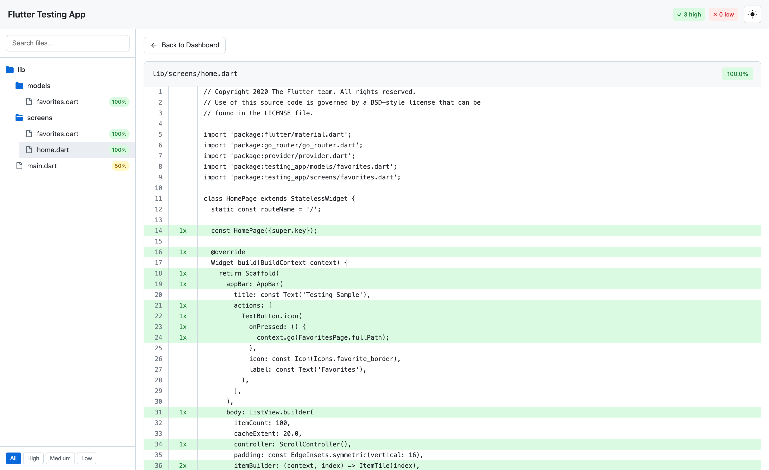 Example of a Flutter Coverage Report HTML file