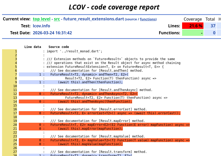 These commands will generate a coverage folder within which you will find an lcov.info file with the coverage results. LCOV is a tool originally written by the Linux Kernel team but has grown to be used throughout software development everywhere. The lcov.info file isn’t especially interesting to read for humans. For example, the top of it for me Result Monad project reads: